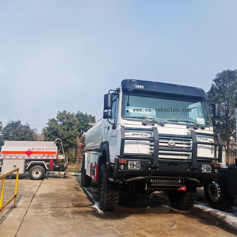 إن شاحنة صهريج الوقود النفاثة المتنقلة HOWO 4x4 Full Drive عبارة عن مركبة تجارية متخصصة مصممة لنقل وتوزيع أنواع الوقود السائل المختلفة، لا سيما في البيئات الصعبة أو على الطرق الوعرة أو النائية حيث قد تعاني شاحنة قياسية 4x2 أو 6x4.